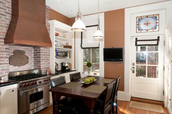 Кирпич за печкой и медная краска придают особой колорит кухне, выдержанной в классическом стиле.