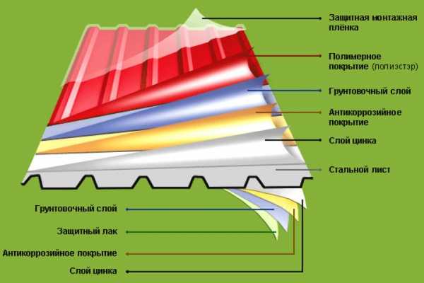 Профиль производится из листов оцинкованной стали методом катания. В процессе выпуска его покрывают несколькими защитными прослойками. Лучший профнастил для крыши обрабатывается антикоррозийным составом, посте этого грунтуется. Затем нижняя часть обрабатывается специальным лаком, а наружная – покрытием из полимеров.