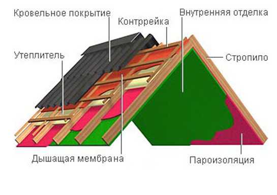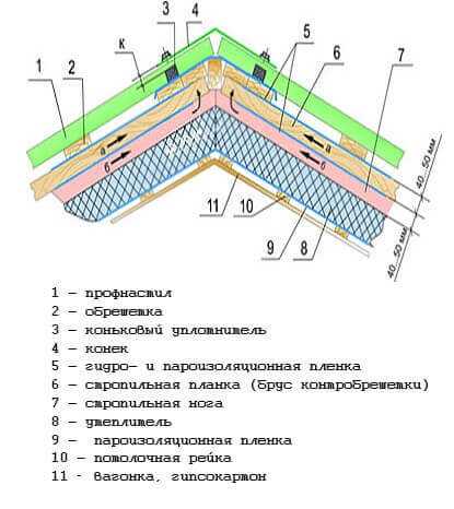 - организацией вентилируемой кровли, создав вентилируемое пространство между слоем гидроизоляции и кровельным материалом. Для этого вдоль стропильных ног устанавливают по гидроизоляции ложные стропила из брусков, по ним делают обрешетку, получится слоеный пирог: стропила, гидроизоляция, ложные стропила, обрешетка, профлист.