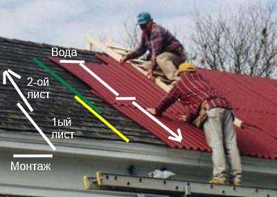 Если направление листов вертикальное, то верхний лист должен закрывать нижний не менее, чем на 20 см. Если шаг волны не позволяет это сделать, нужно сделать внахлест больше, но таким образом, чтобы волны совпали.