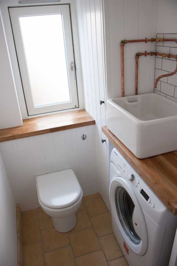 Также можно рассмотреть интересные варианты, с расположением стиральной машинки над унитазом, но многие могут посчитать, что идея слишком глупая, постоянно придётся слушать гул машины над головой, находясь в туалете. Тем более неудачный вариант, если вы живёте не один, а с целой кучей людей.
