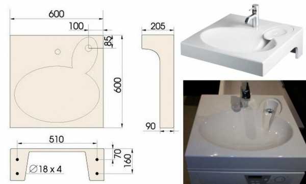 Для специальной техники нужна будет и специальная раковина. Почему? Потому что стандартные модели раковин не смогут закрыть собой верхнюю часть техники, а сама машинка будет сильно «выпирать». А еще это не очень удобно для ваших коленей – они постоянно будут биться о стиралку. Для машинок выбирают специальные раковины – «кувшинки», у которых глубина слива составляет до 20 сантиметров. Моделей «кувшинок» существует множество и среди них есть конструкционные особенности, которые стоит учитывать при выборе раковины.