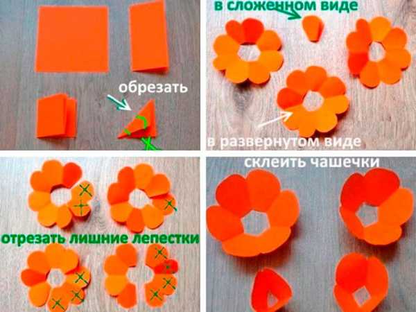 Измените каждую заготовку таким способом: в нижней (последней, четвёртой) заготовки срежьте 1 лепесток, чтобы осталось 7. В третьей заготовки – срежьте 2 лепестка, чтобы осталось 6. Во второй заготовке – срежьте 3 лепестка, чтобы осталось 5. В первой самой верхней заготовке – срежьте 4 лепестка, чтобы осталось 4.- Склейте заготовки в чашечки таким образом, чтобы крайние лепестки были склеены между собой (друг на друга, полностью внахлёст). Должны получиться чашечки в 2,4,5 и в 6 лепестков.