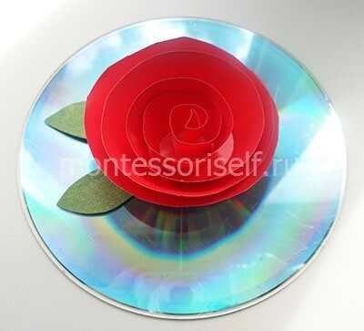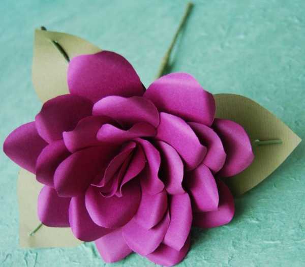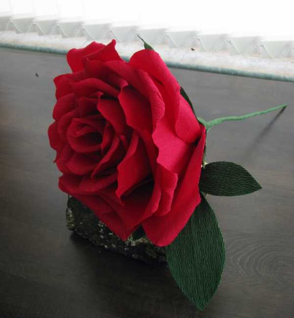 - Роза из бумаги готова! Можно добавить к ней листочек из зелёного картона и насадить бутон на сухую веточку, найденную во дворе. А ещё можно сделать целый букет из бумаги любого цвета и размера.