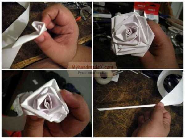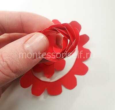 Вокруг основы надо закручивать последовательно лепесточки, фиксируя их на клей, пока не сформируете необычно красивую розу.