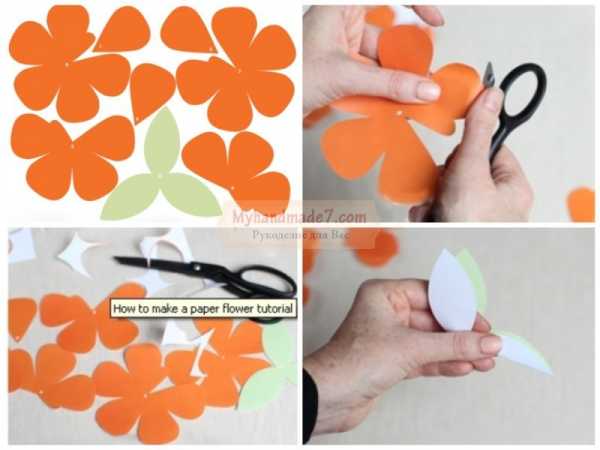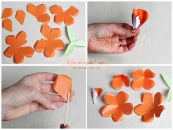 Оставшиеся три лепестка другой формы мы скручиваем трубочкой вместе по очереди, склеивая концы.