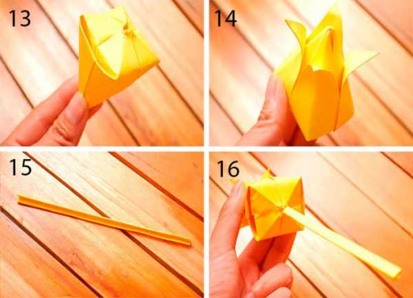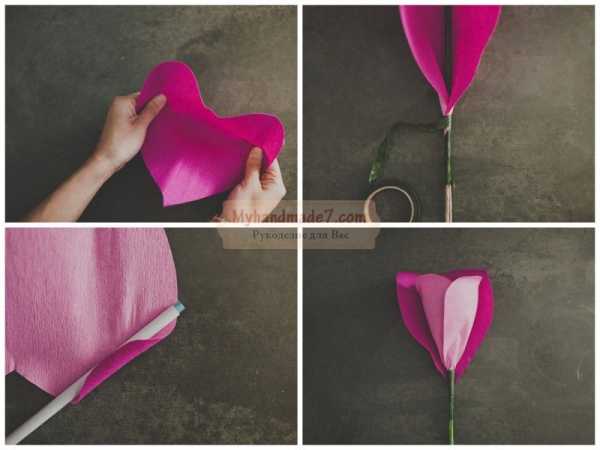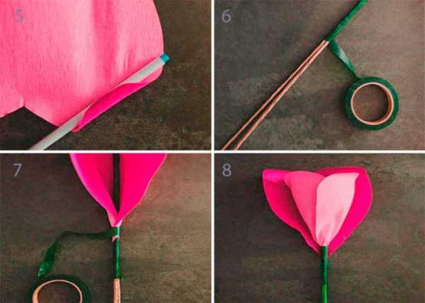 Далее можно формировать бутон: сначала обернем вокруг стебелька первый лепесточек, внизу его надо зафиксировать лентой или клеем. Затем таким же образом, надо использовать остальные заготовки-лепестки, оборачивая их вокруг серцевинки.