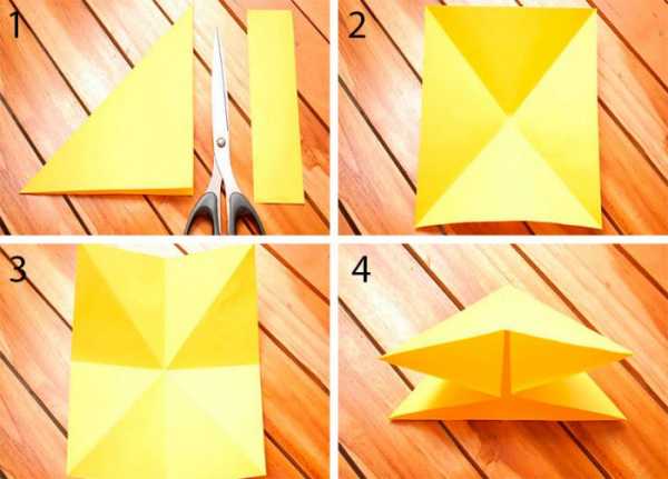 - Сложите лист цветной бумаги по диагонали как показано на фото и отрежьте лишнюю полосу, чтобы получился квадрат.