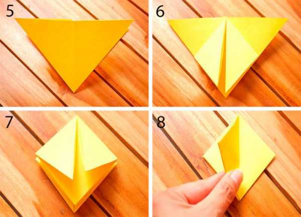 - Сложите квадрат оранжевой бумаги в 4 раза, затем напополам по диагонали, чтобы получился треугольник.