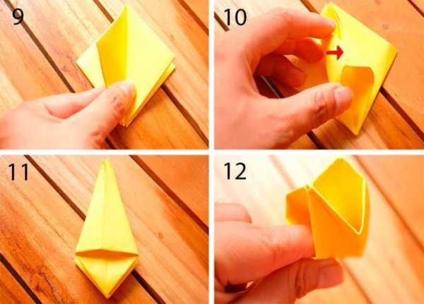 - Сгибайте полоску по диагонали, следуя инструкции на фото. Всё не так просто, как кажется, — попробуйте сделать это сами.