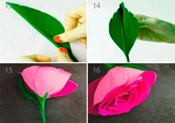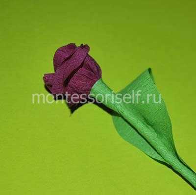 - Вырежьте из зелёной бумаги листочки, сложите их гармошкой, затем приклейте их к бутону.