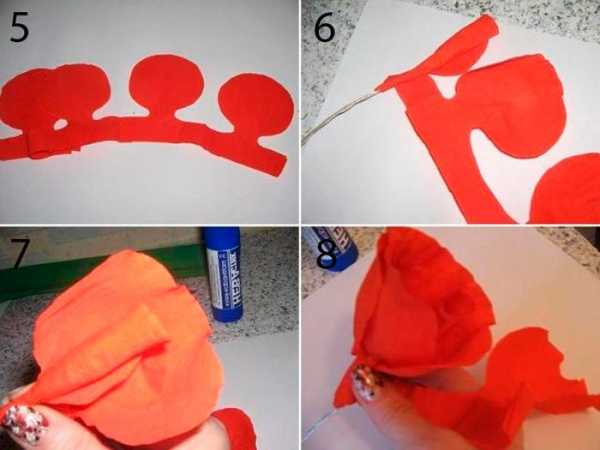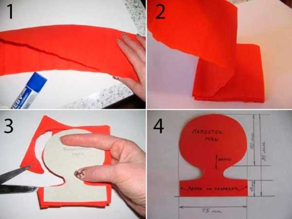 Из яркой гофрированной бумаги вырезаем 3-4 цветочка. В данном случае мы взяли 4 цветочка (роза будет пышнее).