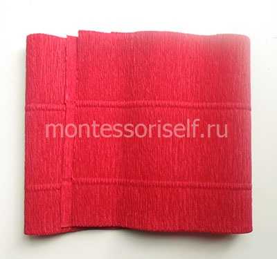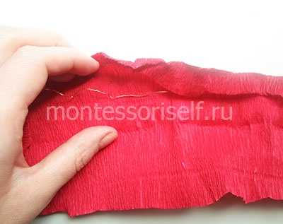 Можно сделать цветок, сочетая несколько оттенков красного цвета: от светло-розовой сердцевинки до ярко-красных краев. Поскольку гофра очень тонкая, ее можно резать, сложив в несколько слоев, поэтому все лепестки у нас получатся одинакового размера и для этого нет необходимости готовить шаблон и обводить его на листе несколько раз.