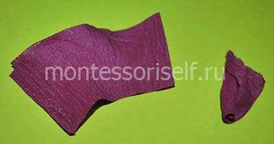 Теперь надо приступать к оформлению лепестков: для начала пальцами необходимо растянуть их в ширину, креп позволяет придавать элементам вогнутую форму, что очень удобно, если хочется создать реалистичный бутон. Далее нам понадобится карандаш, на который вам следует намотать верхний край каждой заготовки.