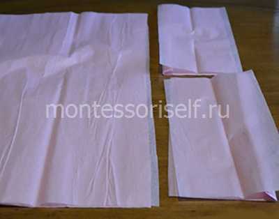 Вырезаем из гофрированной бумаги полоску примерно 25х5 см, чем длиннее будет ваша полоска, тем больше будет роза.
