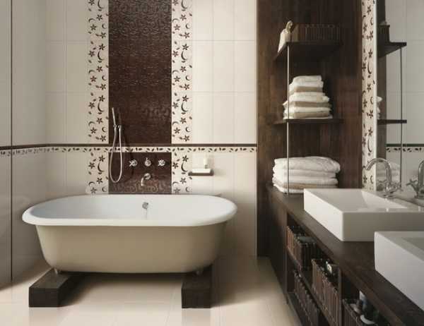 На рисунке: Дизайн ванной комнаты решен в классической бежево-шоколадной палитре