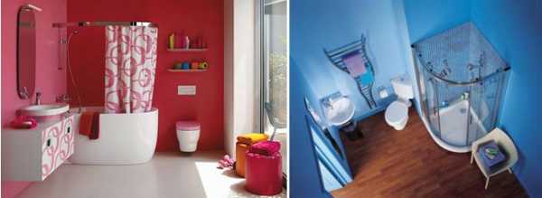 Если нет возможности исключить из интерьера ванной элементы мебели, а также оставить открытым пространство под ванной, недостачу места можно возместить цветовым оформлением. В большинстве случаев наиболее выигрышно смотрится сочетание светлых стен и ярких аксессуаров.