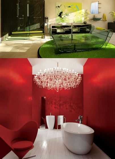 Можно обыграть какую-то сценку. Например, дизайн ванной комнаты как бы является продолжением санузла, или наоборот. Комнаты могут быть противоположностями друг друга. Ванная комната белая с полосками красной плитки, в тоже время как санузел красный с полосками белой плитки. Здесь вы вольны делать то, что хотите.