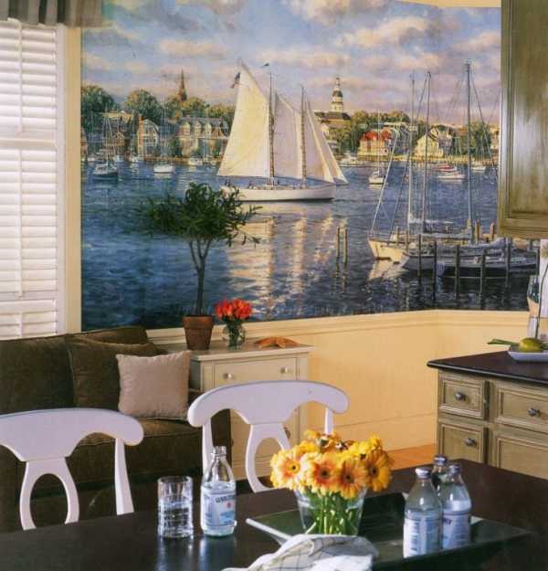 Для дизайна в стиле кантри или классика, подойдут городские, морские, горные и деревенские пейзажи, натюрморты, рисунки и фотографии флоры. Однако цветовая гамма фотообоев должна плавно вписываться в базовые цвета всего помещения.
