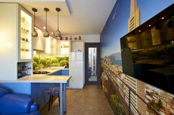 - Узкую кухню необходимо визуально расширить. Для этого можно использовать панорамную фотографию, которая будет занимать всю стену. Причем фотография должна иметь горизонтальное расположение и содержать картину пляжа, морского пейзажа, гор, полей или степи.