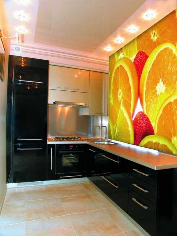 - Чем меньше кухня, тем меньше размер фотообоев нужно выбирать. Попытки расширить пространство за счет оклеивания целых стен пейзажами, приведут к обратному эффекту. Лучше использовать небольшие по размеру панно, создавая, так называемые, фотоокна. Если же вам чертовски хочется фотообои во всю стену в кухне размером 2,5х3, то выберите светлое изображение, где не менее трети занимает пространство, воздух и вода. Макрофотография ломтика лайма, который падает в воду, создавая веер брызг, подойдет для маленькой кухни гораздо лучше, чем изображение лесной аллеи.
