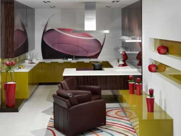Яркие фотообои на кухне в стиле «хай-тек»Важно! Хай-тек не любит смешения идей. Выбирая этот вид оформления интерьера, стоит забыть о сентиментальных вазочках, разноцветных ковриках, посуде в цветочек. Этот дизайн интерьера требует точности исполнения даже в самых маленьких деталях.