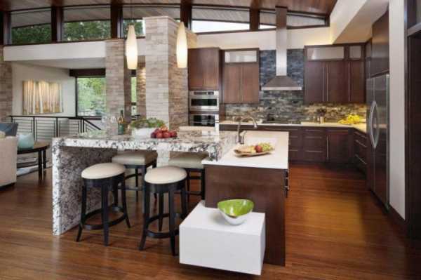 Фотообои нашли своё применение в оформлении кухонь. Вариаций их использования множество, например, можно удачно расширить пространство комнаты при этом сделать кухню практичной и комфортной.