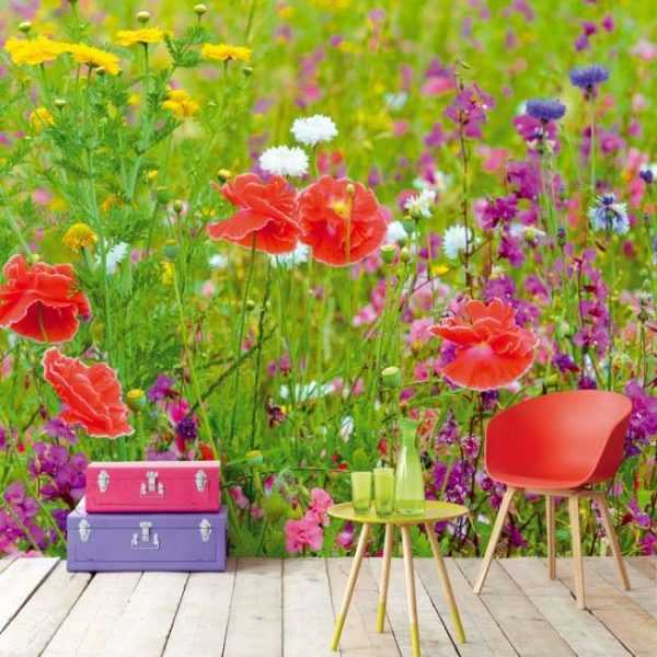 Яркие, сочные цвета на обоях будут отлично гармонировать с мебелью и текстильным материалом одного тона.