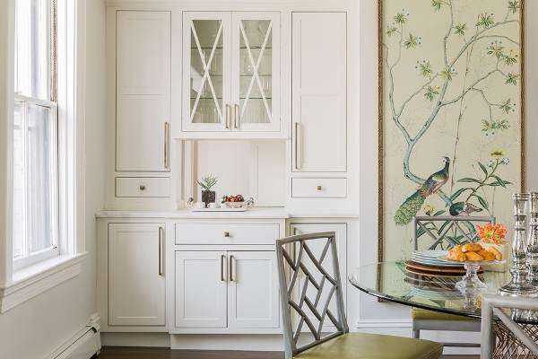 Такой вид фотообоев, представленный на фото, чаще всего призван дополнить имеющий интерьер, а не стать его основой. На полотне обычно изображен какой-то многократно повторяющийся узор, не имеющий броских очертаний, не бросающийся в глаза, не оттеняющий всю остальную отделку кухни. Интересно смотрятся фотообои с геометрическими фигурами, или силуэты их напоминающее. Так часто повторяющиеся стволы деревьев или бамбука будут не только дополнять интерьер, как это показано на фото, но и визуально поднимать потолок. А вот горизонтальные мотивы способны расширить пространство даже самой маленькой кухни.