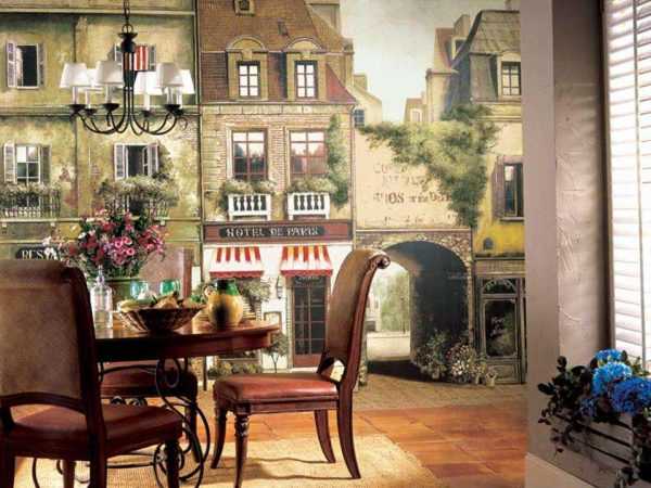 Их легко узнать по изображению известных городов, улиц, архитектурных построек. Часто используются фотографии террас, балконов, распахнутых окон, которые визуально продлевают пространство. Наполняют его чувством простора, необъятности. На фото вы можете увидеть интересный вариант фотообоев с панорамой улицы.