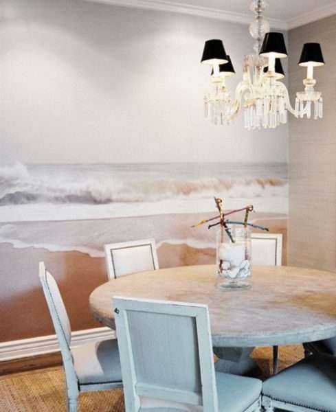 - Обои в холодных тонах визуально увеличивают пространство, поэтому для малогабаритной кухни или столовой стоит выбирать изображения, где преобладают разные оттенки синего, голубого и зеленого цветов.