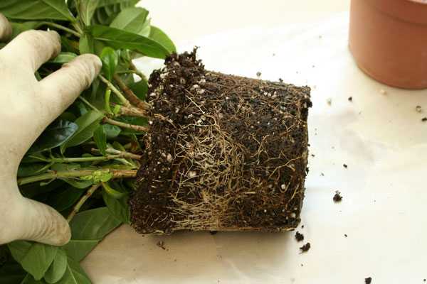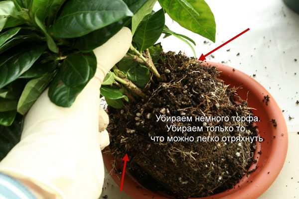2. Пересаживаем гардению осторожно – вытащив её из горшка, нужно немного освободить ком от торфа — то, что отряхнётся легко, можно выбросить.