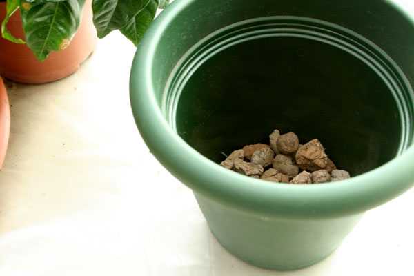 - Подготовьте более широкий и глубокий горшок, выложите на дне мелкие камешки в качестве дренажного слоя.