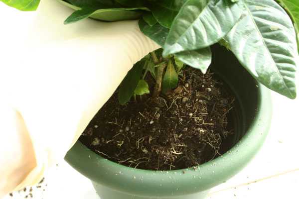 - Установите гардению вертикально в новом горшке, присыпьте с боков оставшийся грунт.