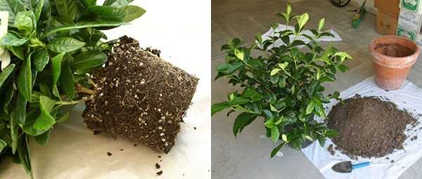 Растение поливают и дают постоять, затем аккуратно переваливают, стараясь не нарушать корни. Такая процедура пройдет безболезненно, даже если гардения цветет. Но лучше всего пересадку проводить весной, до начала цветения. Спустя месяц-полтора после пересадки возобновляют подкормки.