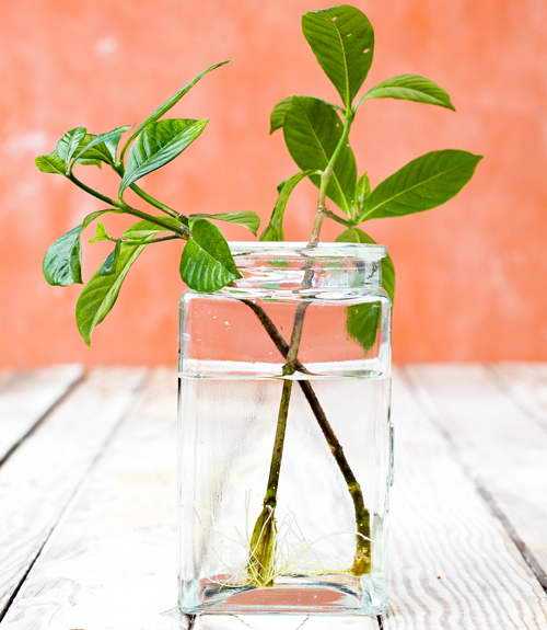 Чтобы размножить Гардению черенкованием с ее молодых побегов срезают частично одревесневшие черенки. Срезку нужно проводить в зимний период (с декабря по март). Длина черенка должна составлять 8 — 10 см. Черенки можно проращивать в воде, добавив в нее средства, стимулирующие образование корней. Но, большинство цветоводов, предпочитают сразу укоренять веточки в специальном субстрате из торфа и перлита (вместо перлита можно использовать мох Сфагнум).