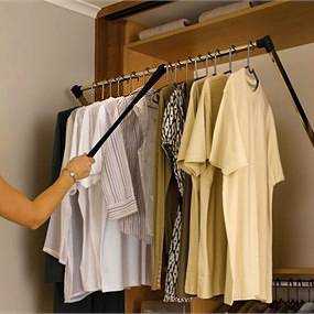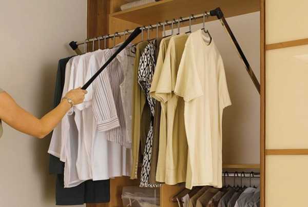 Пантограф – это штанга со специальным механизмом, позволяющим её опускать на удобную высоту. Пантограф очень удобен, если под хранение коротких вещей вы решили задействовать всю стену.