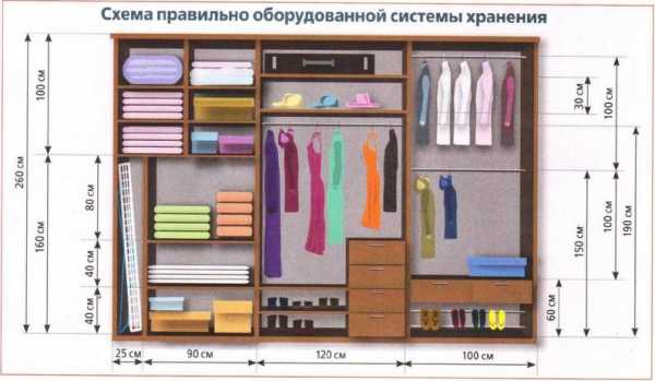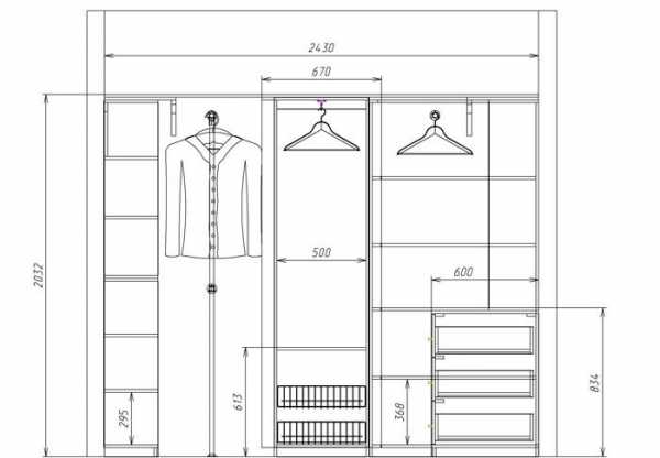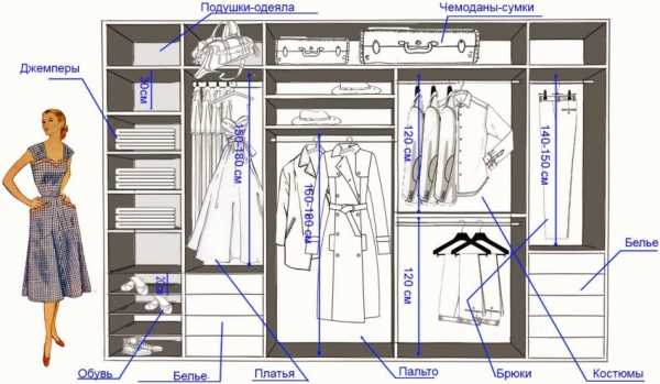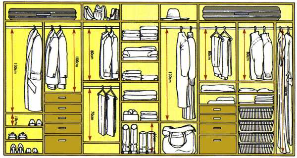 Вещи, хранящиеся на плечиках, бывают двух типов: длинные и короткие. Для первых предусматривается отсек от 1, 5 метров, для вторых – около 1 метра.
