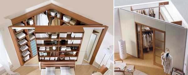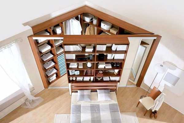 - здесь невозможно установить полноценный и большой шкаф, поэтому оптимальным решением считается крепление к стенам многочисленных полочек или маленьких шкафчиков;