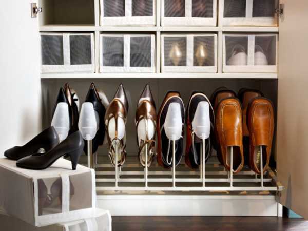 Обувь, как известно, бывает с каблуком и без, открытая и закрытая, мягкая и формованная, летняя и зимняя (ботинки и сапоги), а также реже встречающиеся «частные случаи» в виде горнолыжных ботинок и т.е. И если с размещением редко используемой или сезонной обуви вопросов нет (она отправится на антресоли, мягкая – в обувных кофрах, остальная – в коробках), то со всем остальным возможны варианты.