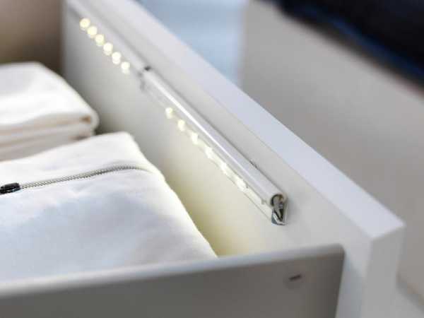 Маленькие гардеробные обычно не обладают окнами, поэтому важно грамотно планировать освещение, причем еще на этапе создания проекта будущего ремонта. Важно сделать не только основное освещение, представленное центральной люстрой, но и пользоваться подсветкой, освещающей содержимое разных полок или ящиков. Наиболее часто для этого используется светодиодная лента, а также можно воспользоваться автономными небольшими светильниками, устанавливаемыми в выдвижных ящиках.