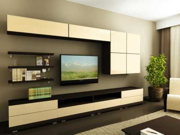 Традиционно телевизор в центре, а по бокам — шкафы. Чтобы они не были тяжеловесными, середина оформлена в светло-бежевом цвете