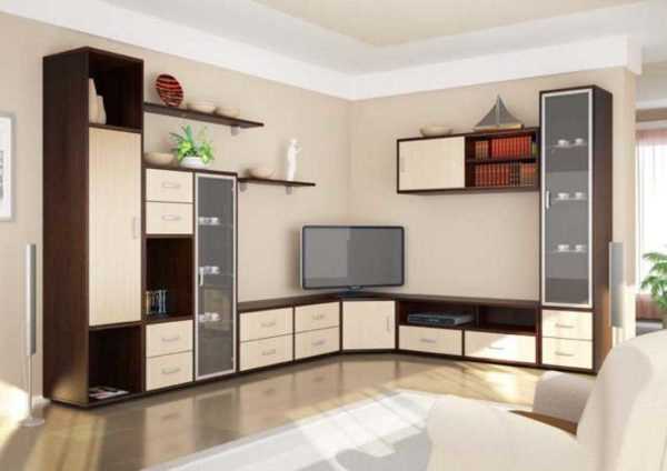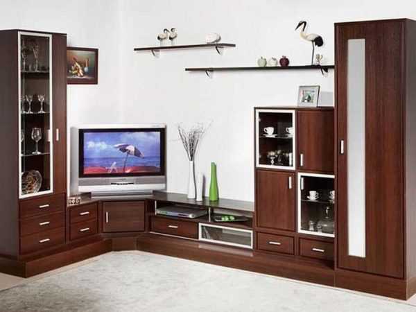Мебель, устанавливаемая в углу всегда интересна, но особой экономии места она не даст, поскольку занимает место вдоль двух стен. Поэтому для таких горок лучше выделять место в больших гостиных. Хотя возможно и решение установки отдельных угловых элементов – тумбочек под телевизор, этажерок.