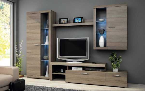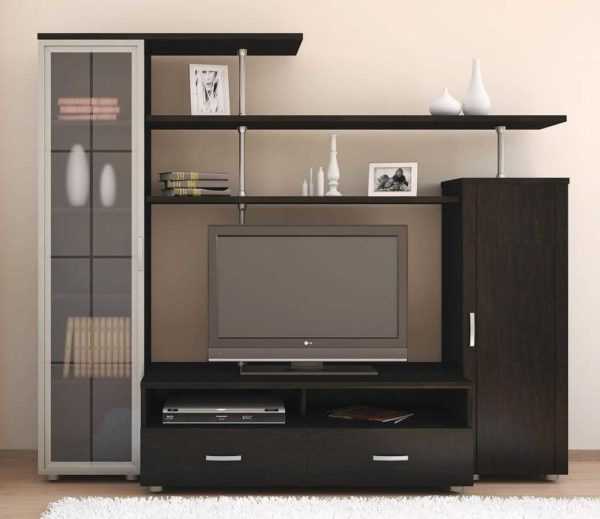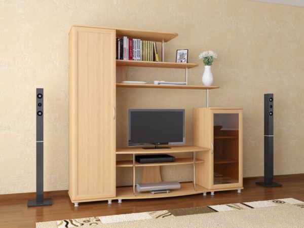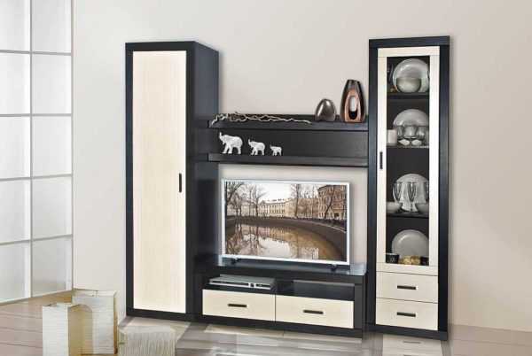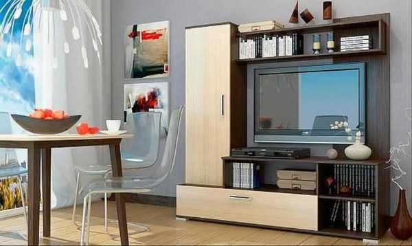 В небольшие гостиные ставить громоздкую мебель не будешь — она окончательно «съест» объем, из-за чего в помещении будет неуютно и неудобно. Для таких случаев есть мини-стенки. Они состоят буквально из нескольких предметов — пару тумб, на которых ставят телевизор и технику, небольшой шкаф и/или комод. Сверху — над тумбой для еще могут располагаться несколько полок открытого или закрытого дизайна.
