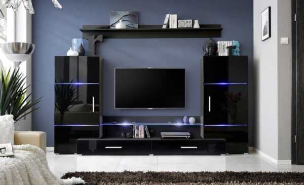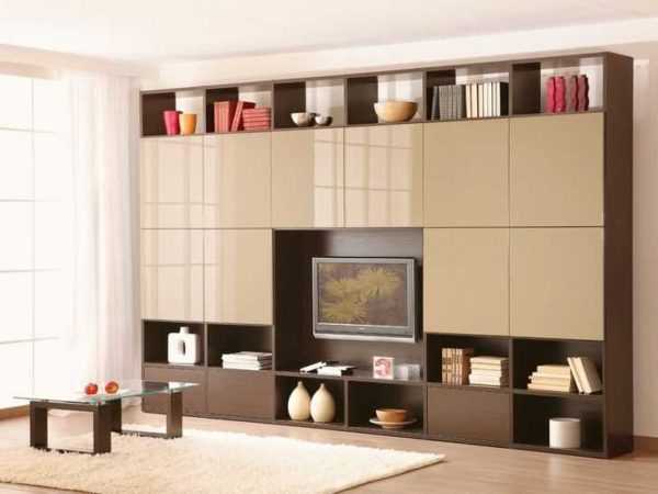 Немного о расположении мебели в стенке горке для гостиной. Если есть шкафы, при линейном расположении их ставят по краям, середину оставляя практически пустой — под установку телевизора ставят низкую тумбу, сверху могут расположить пару полок.