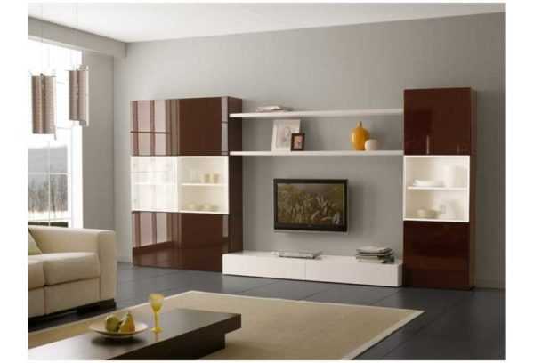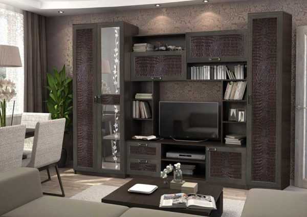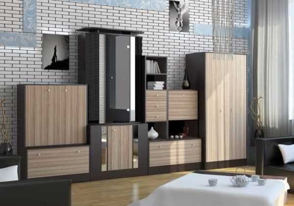 Современные стенки для зала, фото которых вы могли видеть в нашей галерее, отличаются необычным дизайном. В конструкции, помимо стандартных тумбочек, могут присутствовать навесные полки, выдвижные ящики, открытые и закрытые отсеки.