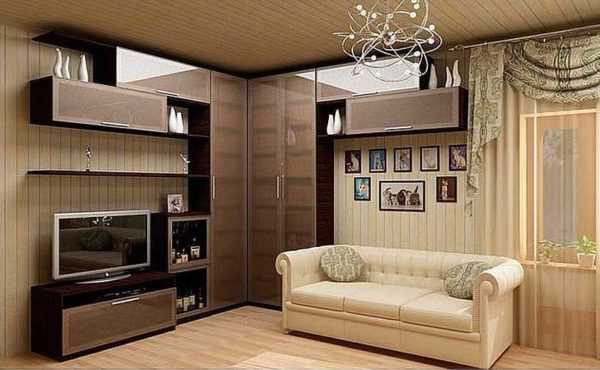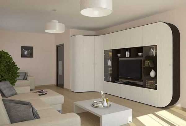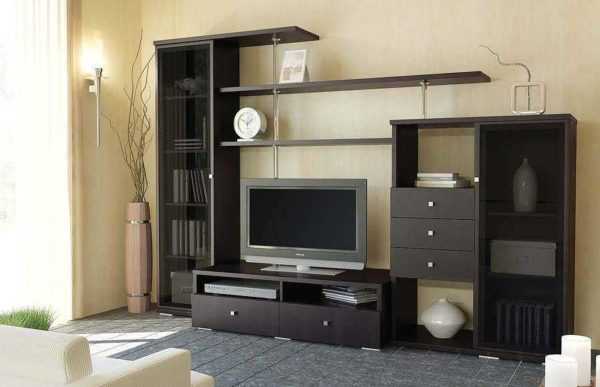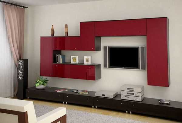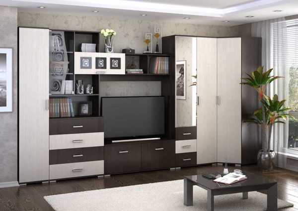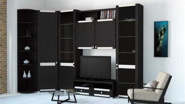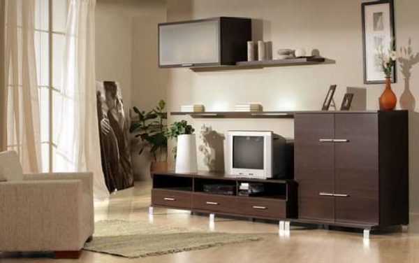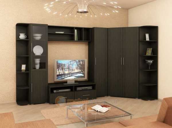 Если ваша квартира не может похвастать большими размерами, то из представленного разнообразия мебели стенка в зал, сконструированная по типу уголка и в виде горки, подойдет лучше всего. Она, во-первых, не займет много места, во-вторых, визуально расширит пространство и оставит простор для других элементов интерьера, а в-третьих, скроет непропорциональное строение комнаты, если таковое имеет место быть. Небольшая же высота конструкции позволит создать эффект высоких потолков в комнате.