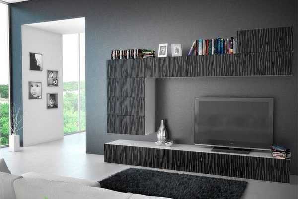 - Серый. Нейтральный цвет, который служит отличным фоном для более ярких вещей. Если вам нужно выделить какую-то другую группу в гостиной, мебельную стенку можно ставить серую. Также серый можно сочетать с другими цветами. Темные оттенки хорошо смотрятся с красной отделкой, средние — с розовым, зеленым, фиолетовым.