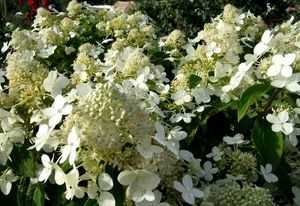 Гортензия дуболистная – декоративный кустарник, вырастающий до 2 метров, с шершавыми, крупными листьями, похожими на дубовые. Осенью листья окрашиваются в красновато-бронзовые или пурпурные и бордовые оттенки. Цветет с середины лета, соцветия пышные, цветки белые, собранные в конусовидные соцветия длиной до 10-20 см. При отцветании из белых становятся пурпурными. Лучше всего гортензия дуболистная развивается на полутенистых участках. Растет быстро, отличается требовательностью к составу и степени увлажнения почвы. Зимой, в условиях Европейской части России, иногда подмерзает.