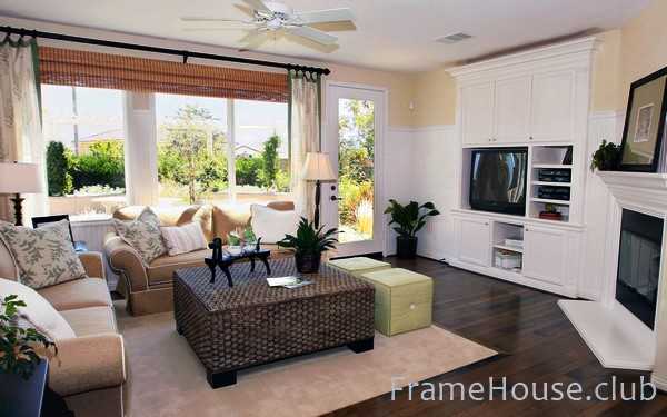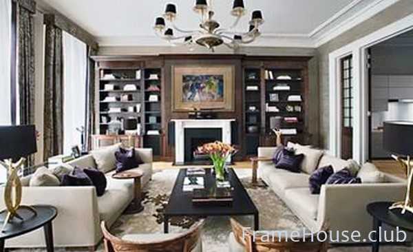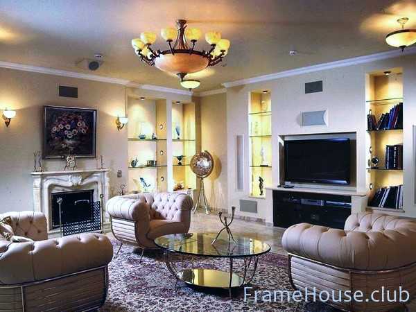 Важно, чтобы мебель была не только красивой, но и уютной. Особенностью интерьера может стать камин, выполненный в стиле классики. Очень часто в просторной гостиной оборудуют кабинет. Стиль для его отделки может быть самым разнообразным.
